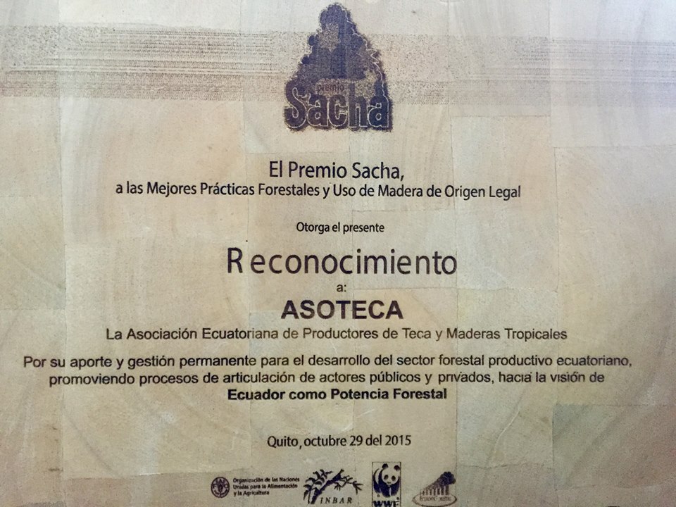 NoticiasÚltimas Noticias Reconocimiento Premios Sacha Publicado el noviembre 5, 2015noviembre 5, 2015 ASOTECA El presidente de la asociación Antonio Pino, recibió durante los Premios Sacha el reconocimiento a ASOTECA por su aporte y gestión permanente para el desarrollo del sector forestal productivo ecuatoriano.
